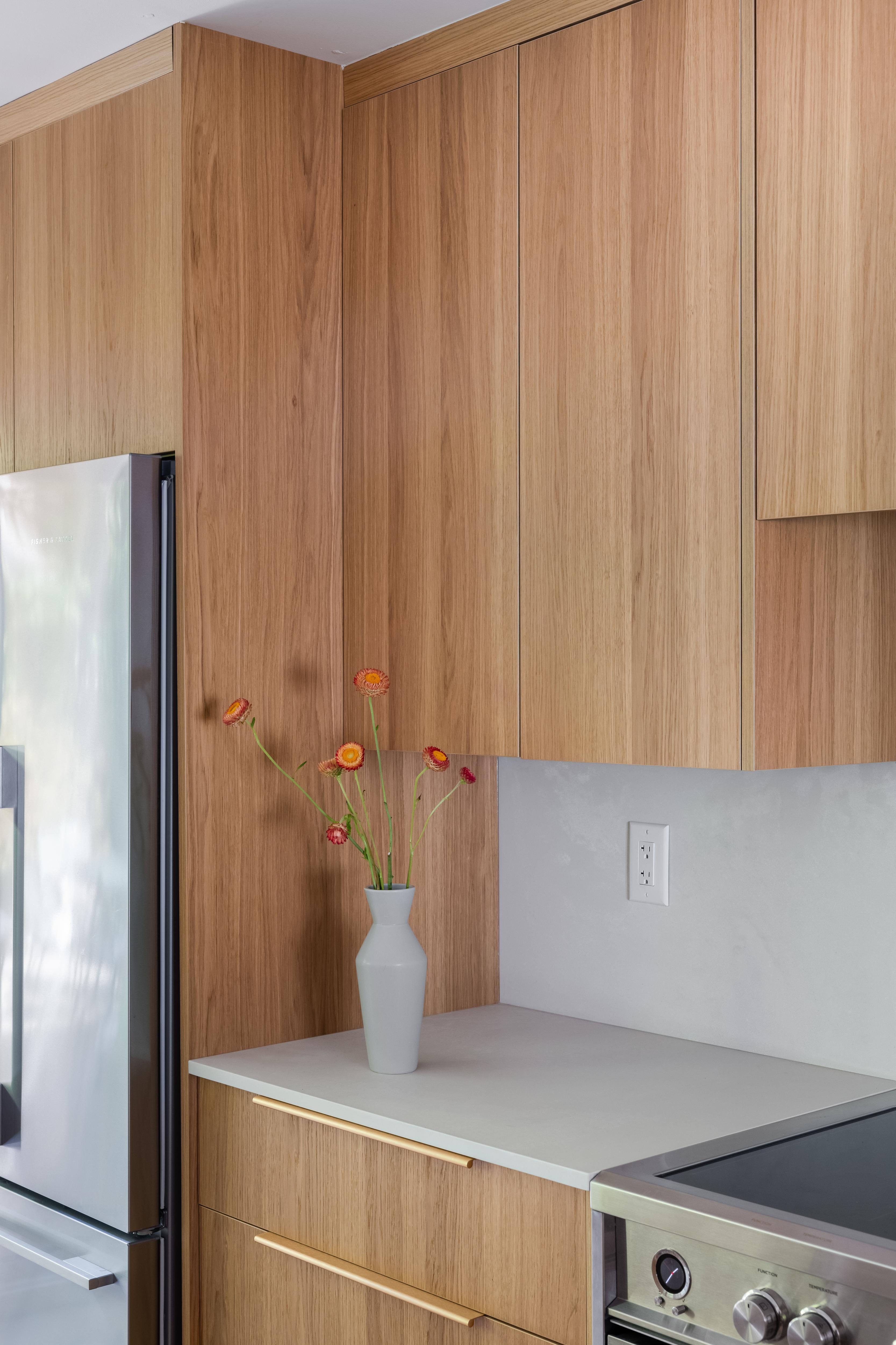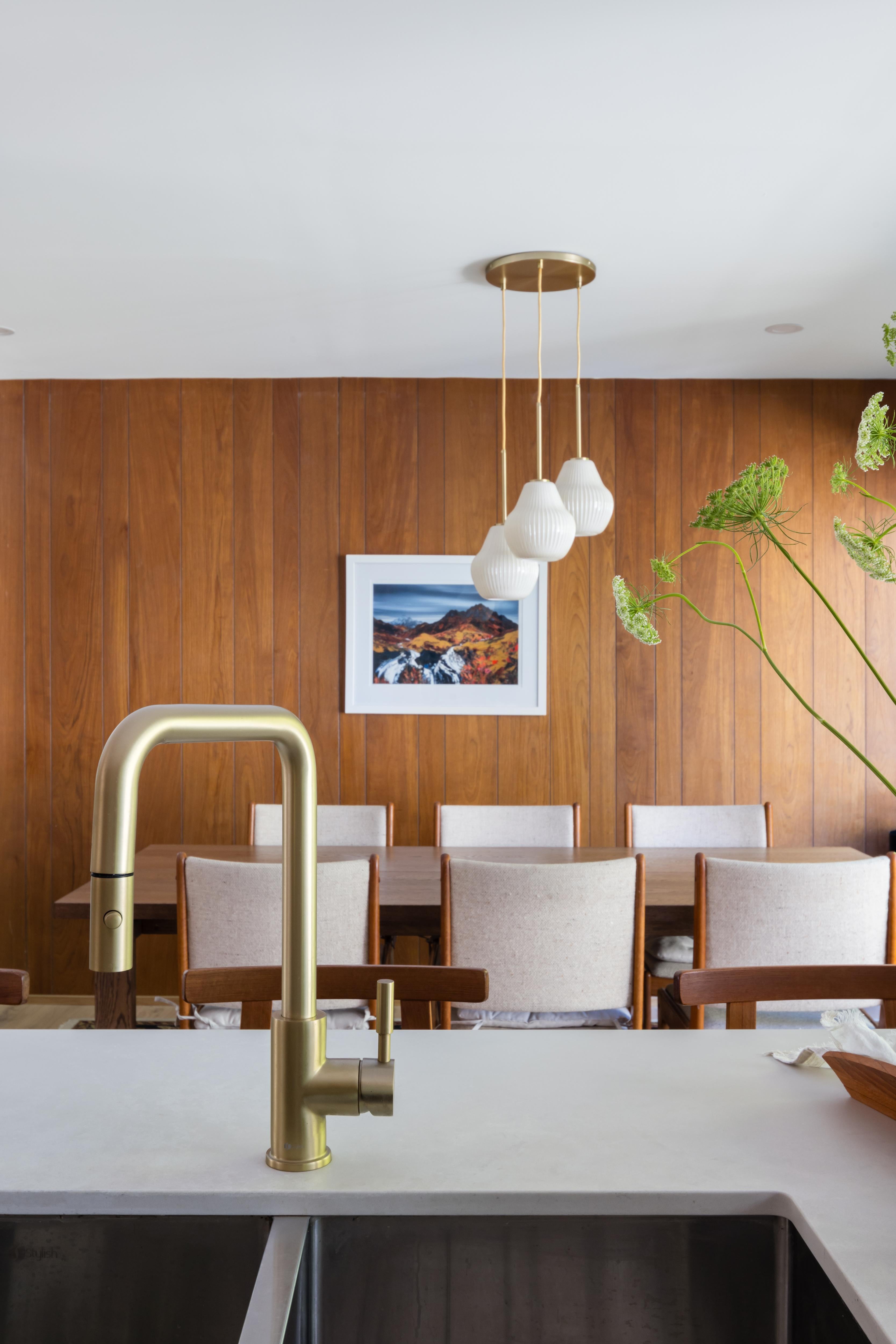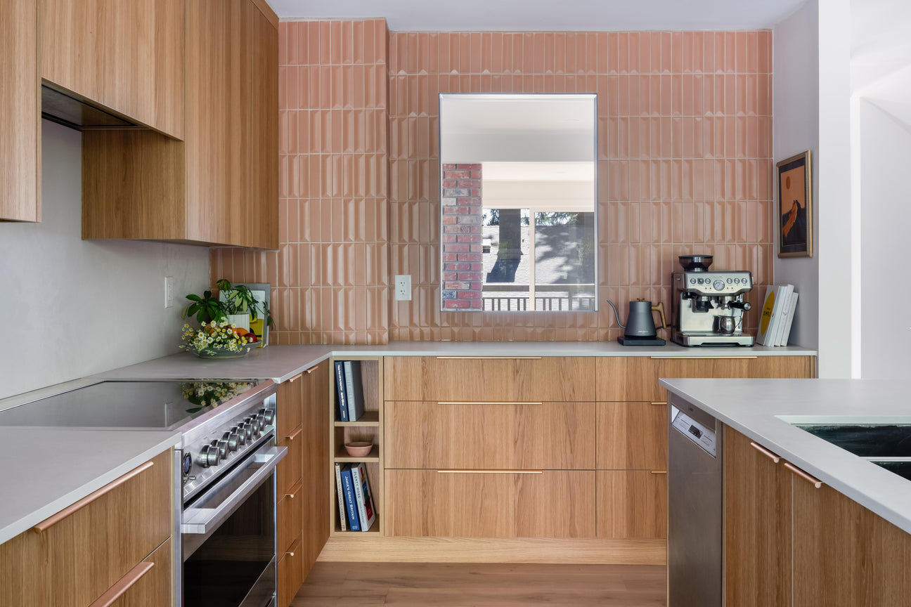 There isn't even a good before angle of this small, cut-off kitchen to truly live up to the magic of the after of this mid-century stunner! Now, this kitchen amazes with its rich earthy tones and tactile textures galore.