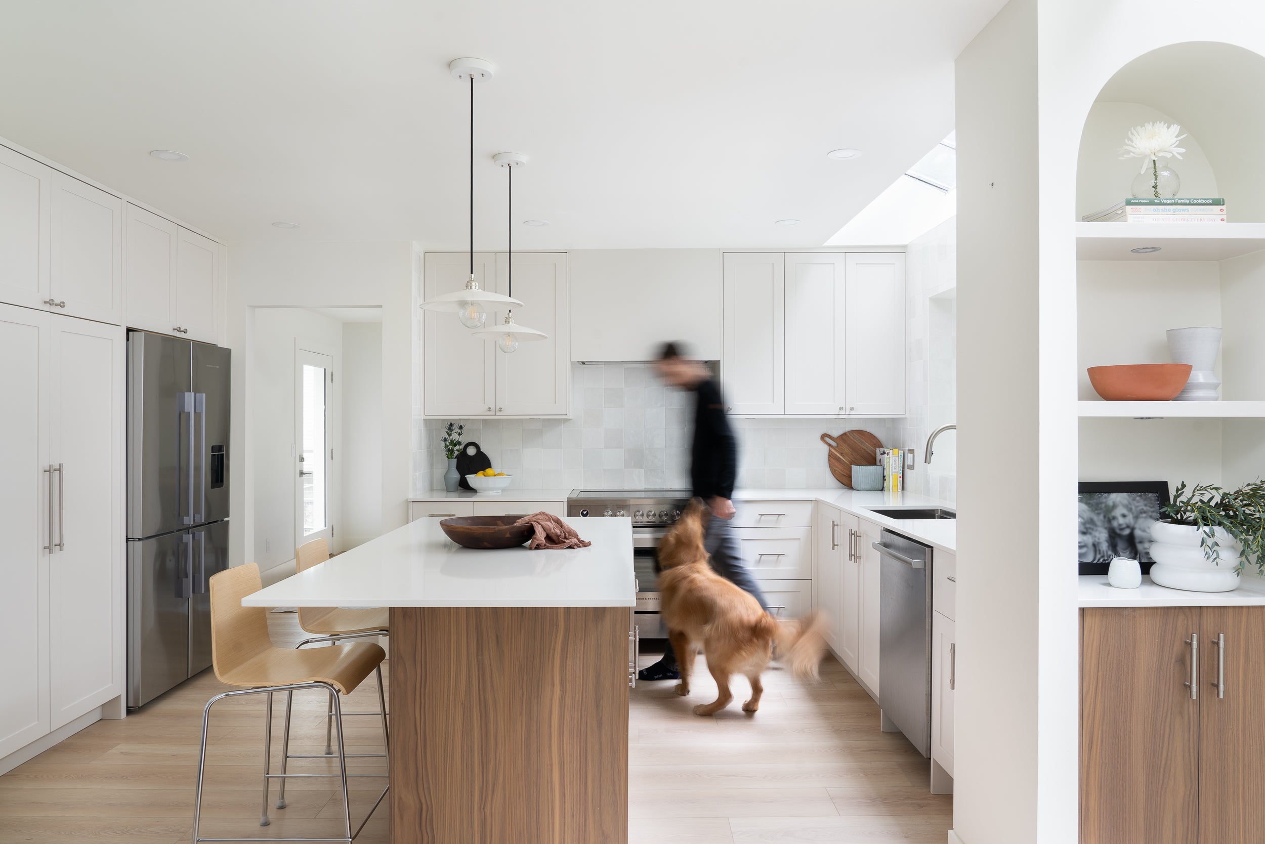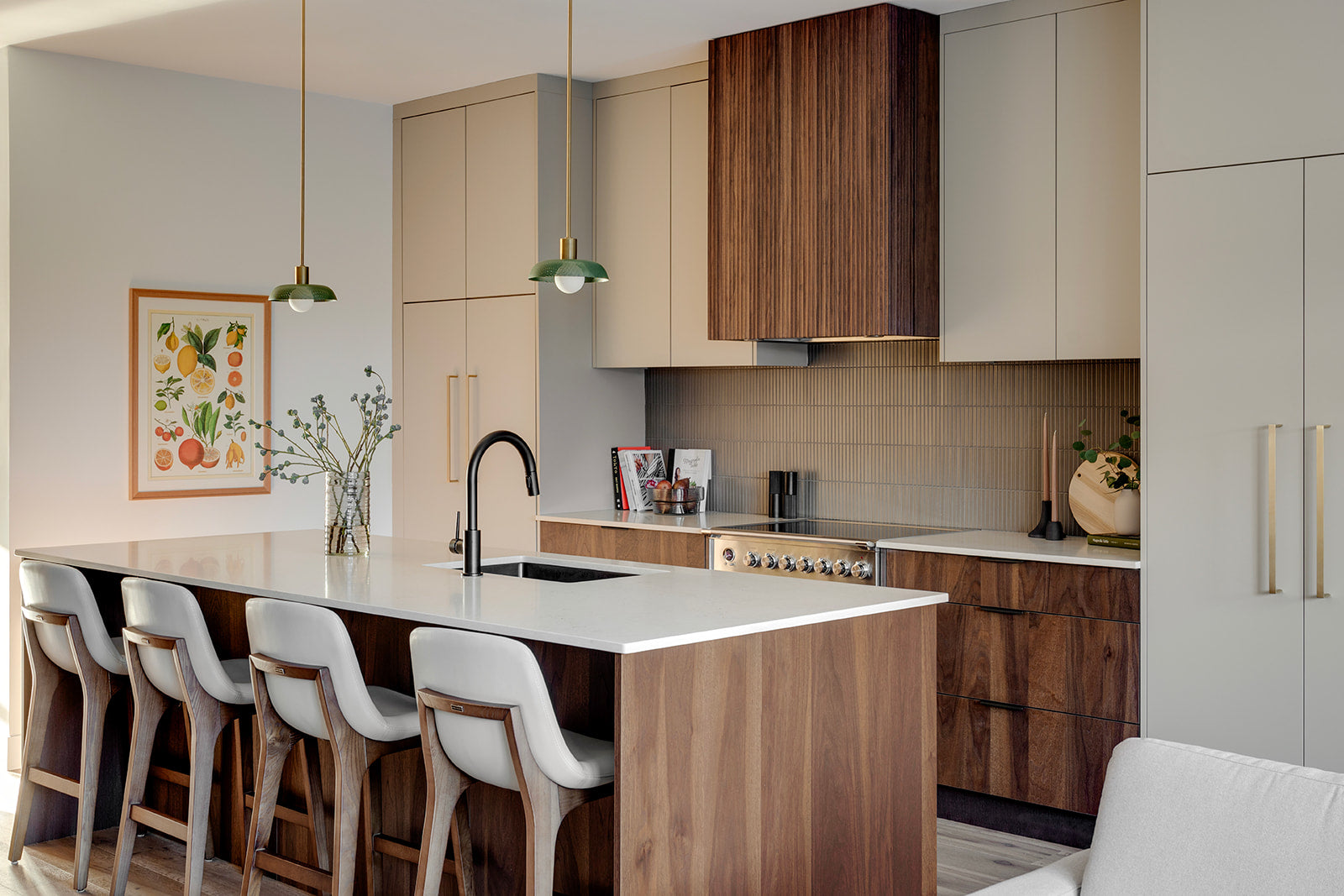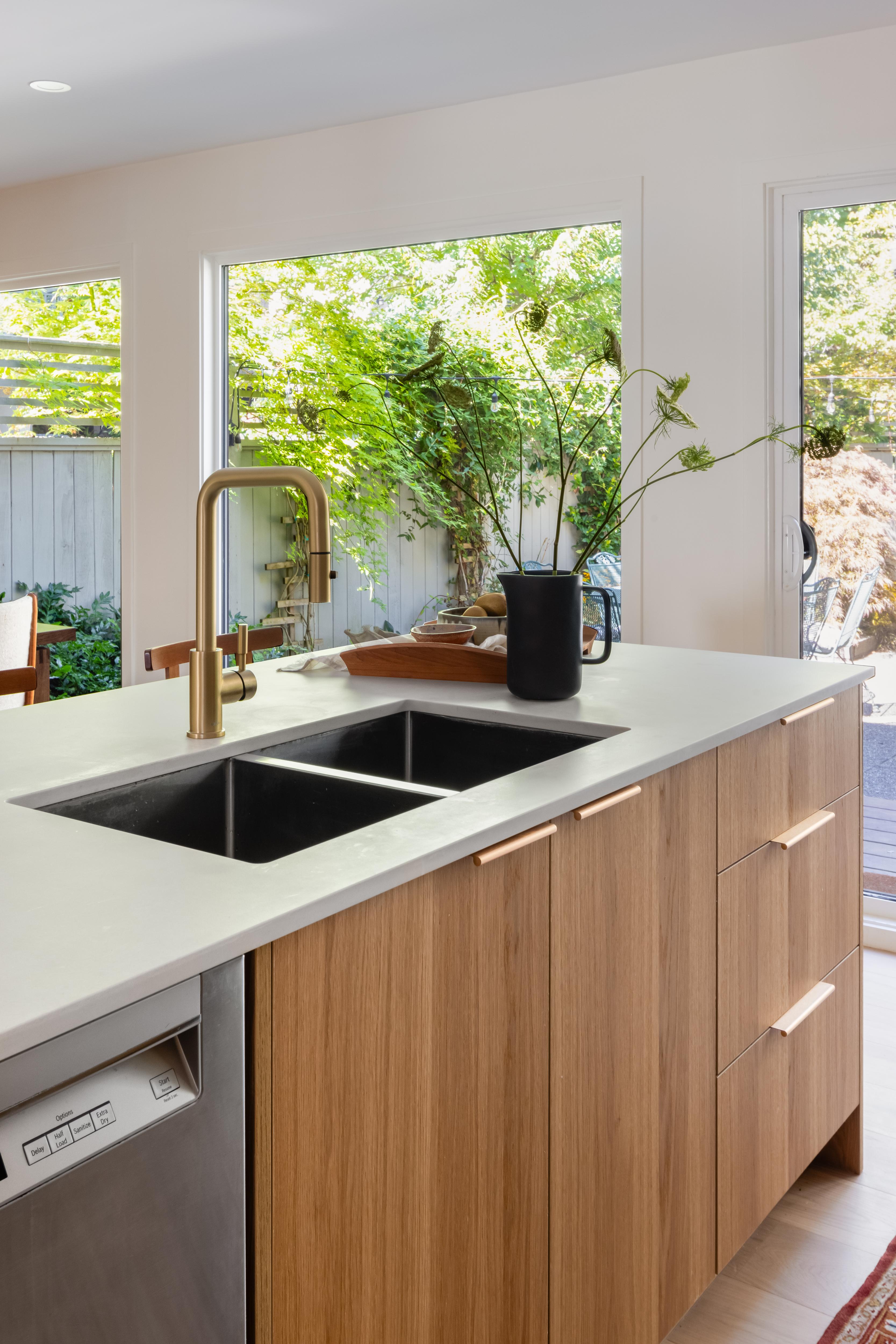 There isn't even a good before angle of this small, cut-off kitchen to truly live up to the magic of the after of this mid-century stunner! Now, this kitchen amazes with its rich earthy tones and tactile textures galore.