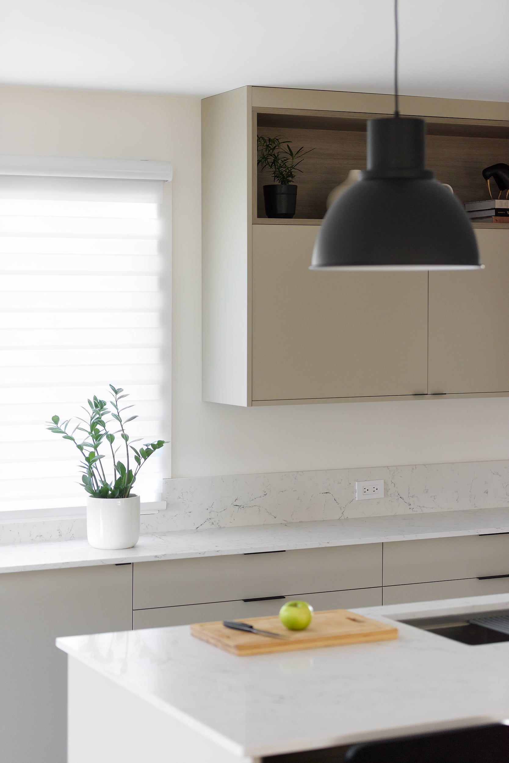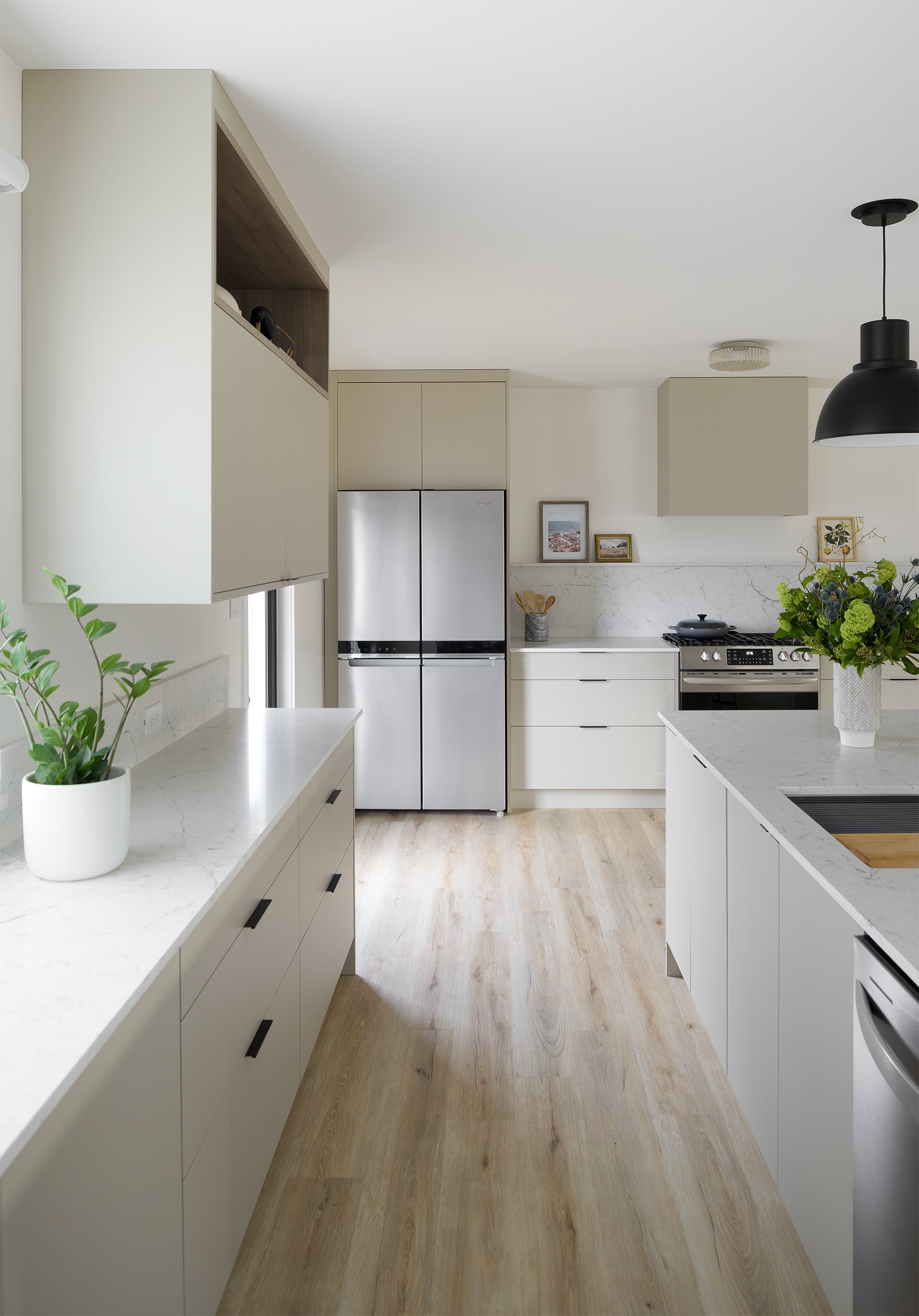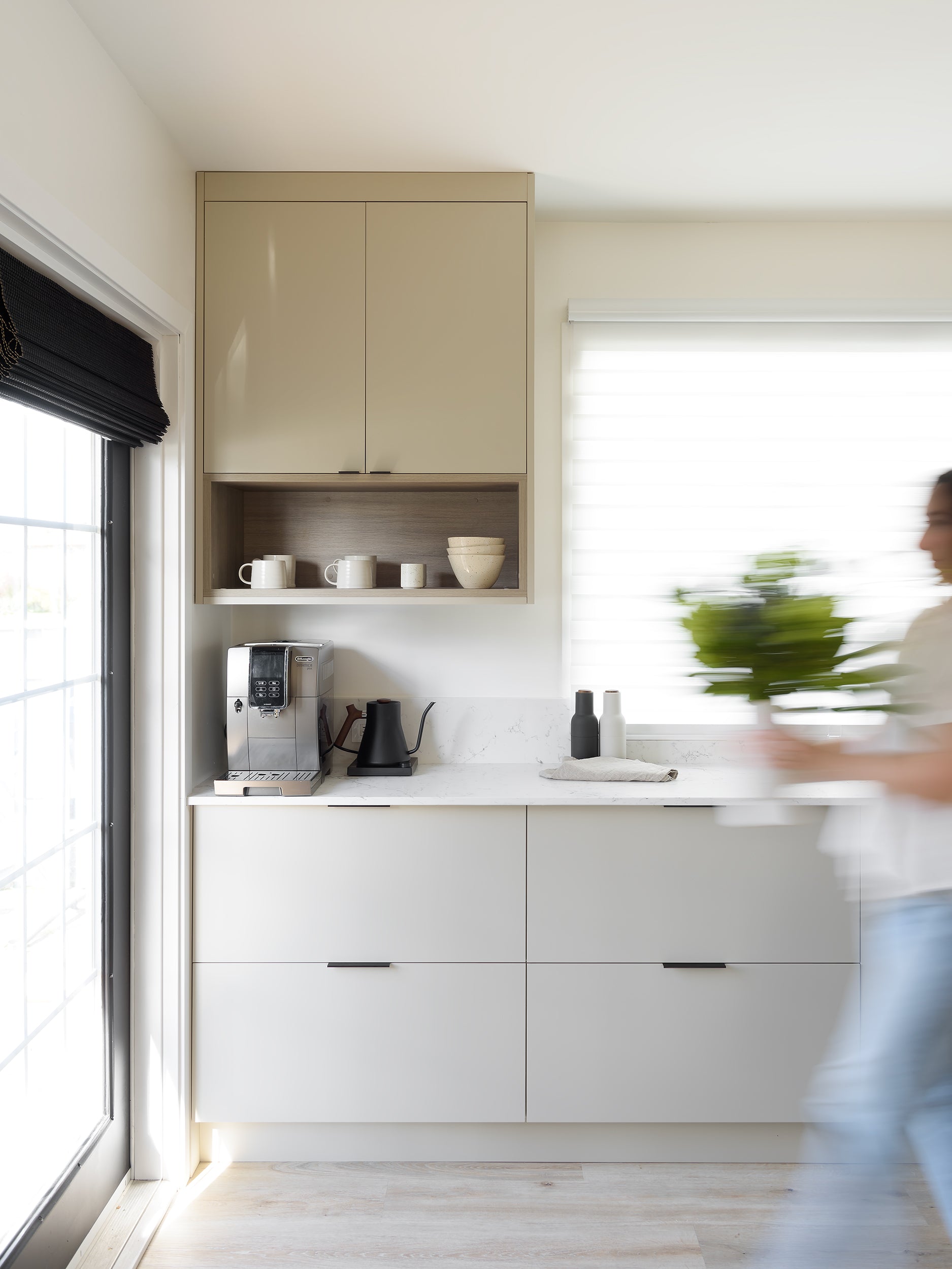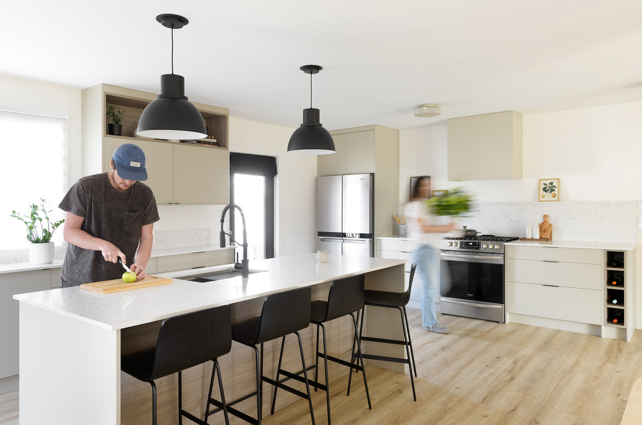 The balance of warmth, texture, and contrast brought by design partner Manda Roy Design is at the heart of this new joyful space. The softness of the linen uppers against the warmth of our Coastal Beachwood provides a soft modern palette that gets it's punch from the bold veining of Caesarstone's White Attica quartz and the minimal matte black pulls throughout.