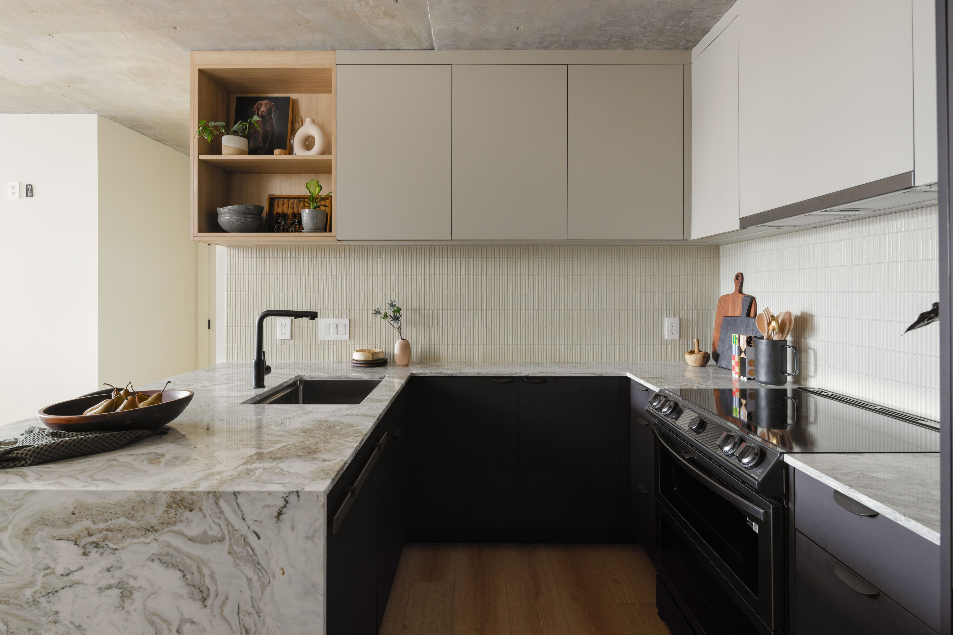 From Home Depot special to Japandi chic. This homeowner knew his new home needed some modern love but didn't want to lose the dark moody vibes. By refreshing the material palette, Ayume Concepts updated this compact condo kitchen with a layered japandi style influence amping up the vibes while simplifying the form.
