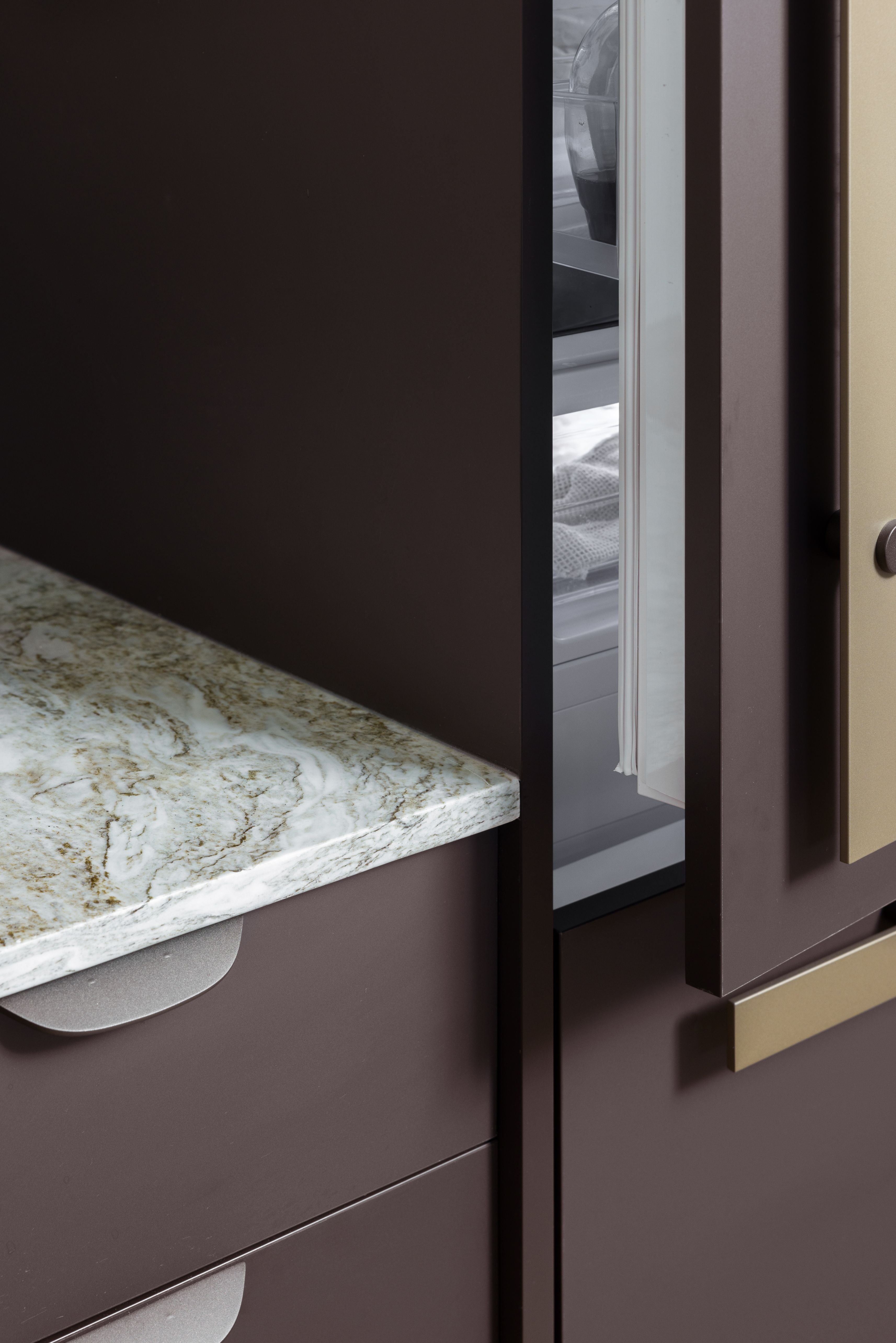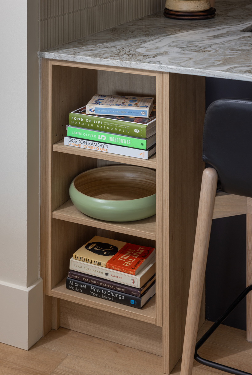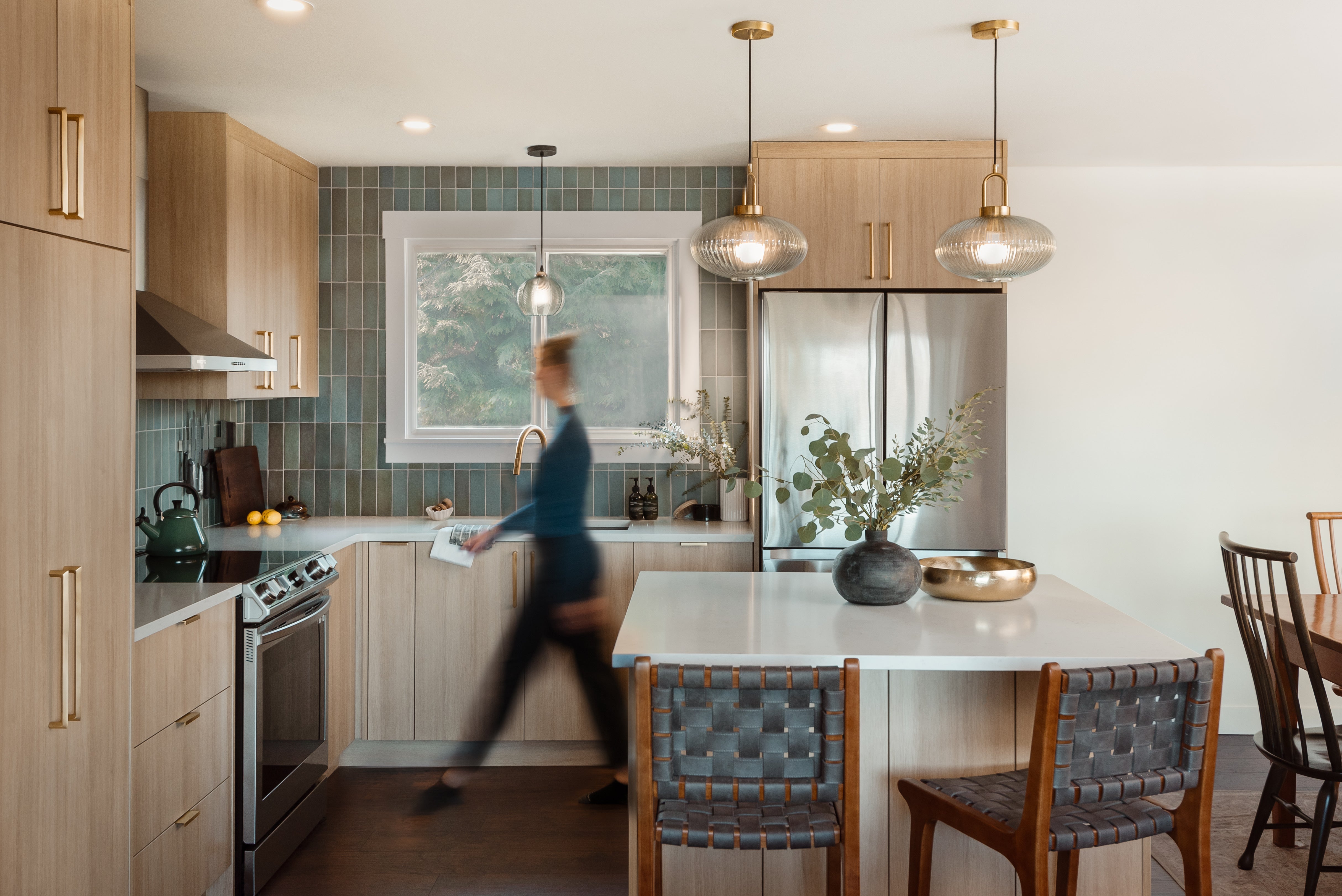 Raised upper cabinets align seamlessly with the integrated hoodfan and the fridge disappears under an integrated millwork panel creating an open and streamlined visual that lets the materials be the star. Balancing all that new open space are the rich textures of the ceramic kit kat backsplash and the stunning Fantasy Brown quartzite slab. The slab's waterfall edge on the peninsula is a show-stopper!