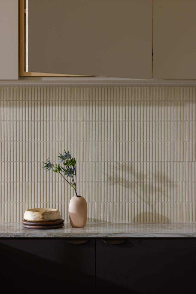 "The intention was to create a space full of personality, use of colour, and mixed patterns to give this small space different vibes. The kitchen is luxurious and tonal while the bathroom is playful and colourful. A mix of materials like concrete ceilings with small Kit Kat tiles and quartzite countertops. "